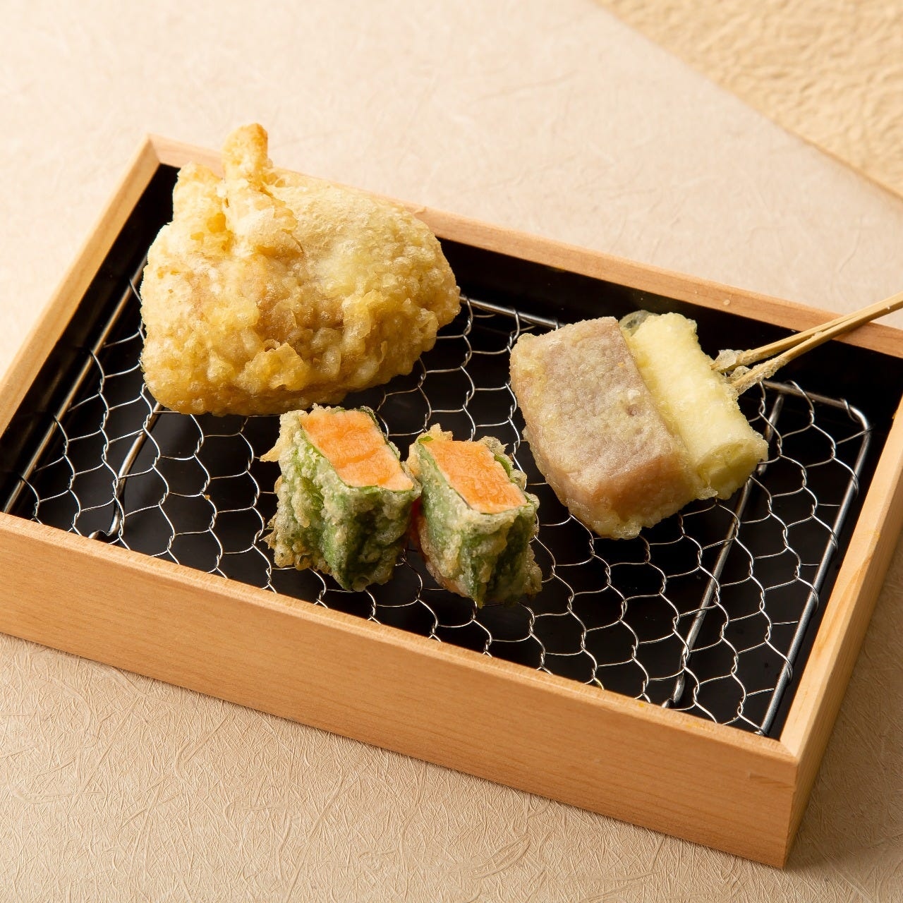 また、創作天ぷらも人気のメニューです。「いももち磯辺巻き」「北海道クリームチーズ生ハム大葉包み」「アボカド生ハム巻き」「鶏つくねの湯葉チーズ巻き」など、当店ならではの味わいをご賞味ください。