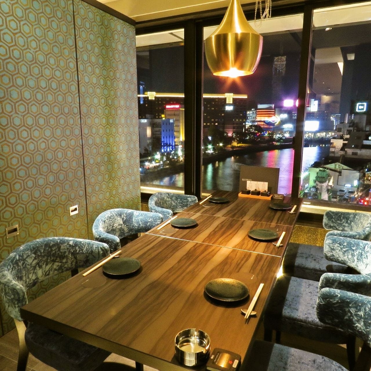当店では、上質な個室空間を豊富に取りそろえています。写真のお部屋は5名様~10名様向けの「テーブル席・完全個室(壁・扉あり)」です。夜景を一望できるお部屋で、非日常のひとときをお過ごしください。